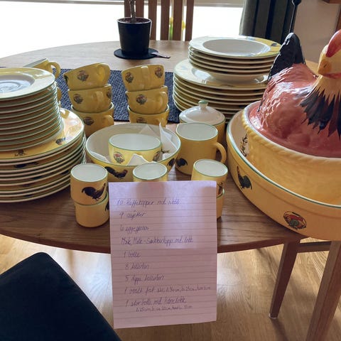 Fyrklövern Pagnossin servise i keramikk/porselen med gult dekor. Serviset består av 10 asjetter 10 tallerkener, 8 dype tallerkener, 8 kopper og 8 eggeglass. Delene har gule flater med motiv av hane og blomsterpotte samt grønne kanter. Selges kr 800,- samlet.