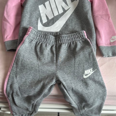 Nike joggedress i størrelse 86-92. Tilsvarer en stor 86 ☺️ Sett med hettegenser og joggebukse i grå bomull og rosa print. Genseren har hette og Nike-logo på brystet, buksen har strikk i livet og Nike-logo på låret. Passer til hverdagsbruk og fritidsaktiviteter.