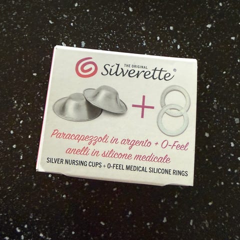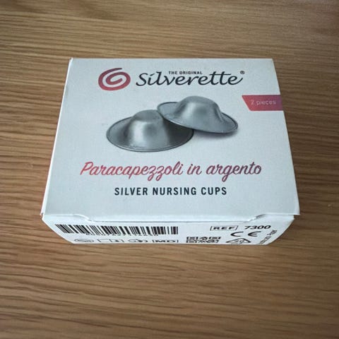 Silverette XL ammekopper i sølv sammen med Medela brystskjold i silikon.