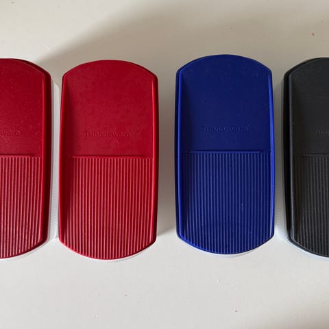 Har noen oppbevaringsbokser med røde lokk til overs. Alle er hele, rene og fungerer som de skal. Høyde på de smale bakerst på bildet er 12 cm, 23 cm og 28,5 cm. Dette med lokk på.