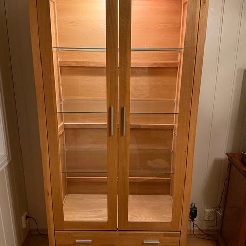 Selger et pent og solid vitrineskap i eik med klassiske glassdører, hyller og to praktiske skuffer nederst. Skapet har et tidløst og varmt uttrykk som passer godt i stue, spisestue eller hytte.