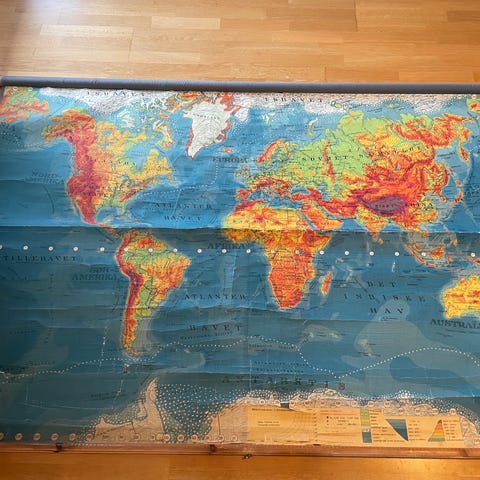 Flott gammelt skolekart over verden selges. Usikker på årstall, men utgitt av Fabritius v/professor Fridtjov Isachsen. Målestokk: 1:23 mill. Høyde på kartet: 117 cm. Bredde på kartet : 180 cm. Kartet er på rull og er litt lengre i høyden overfor selve kartet. Kan sendes.