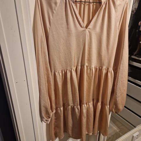 Kjole fra Bik Bok i størrelse XS. Kjolen er beige og laget av 100% organis bomull. Modellen har lange ermer, v-utringning og løs passform med volangdetaljer i skjørtet.