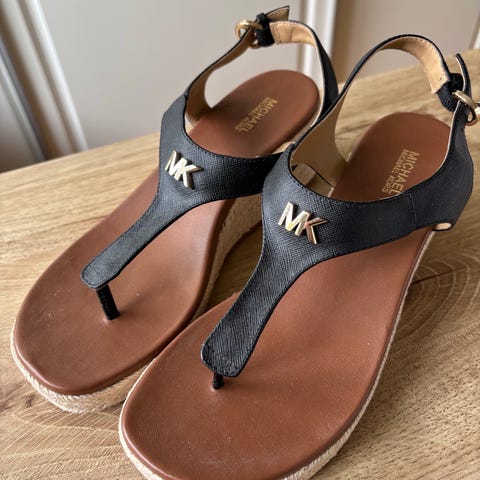 Michael Kors sandaler i størrelse 40 for dame. Modellen har tynne remmer og rund tå med metallmonogram på vristen. Ett par i svart og ett par i hvitt, begge i skinn med gummisåle preget med MK-logo under. Flate sandaler som egner seg til hverdagsbruk og sommerantrekk.