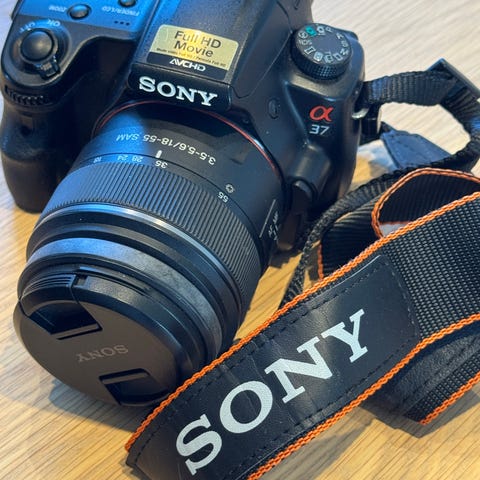 Kameraet har innebygd blits, hotshoe for ekstern blits og tilkoblingsmuligheter via porter på siden. I bildene følger det med objektivdeksel, skulderreim og lader/strømkabel.
