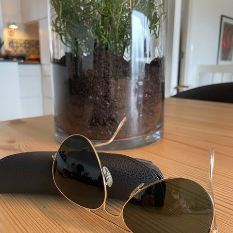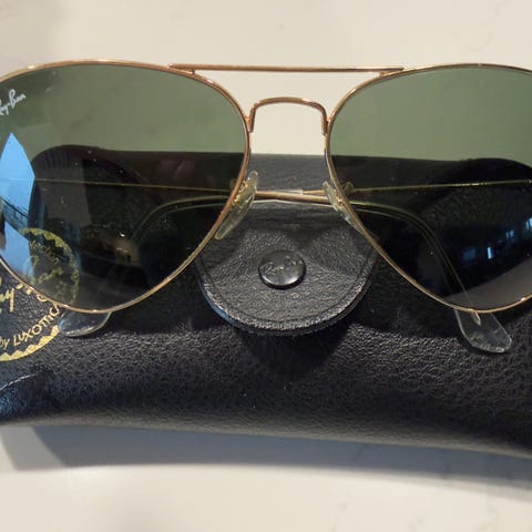 Ray-Ban Aviator solbriller for unisex med grønn linse og gullfarget metallinnfatning. Klassisk pilotfasong med tynne stenger og justerbare nesestøtter. Leveres med originalt Ray-Ban-etui i sort kunstskinn med trykknapplukking. Passer til både hverdag og bruk i sterkt lys.