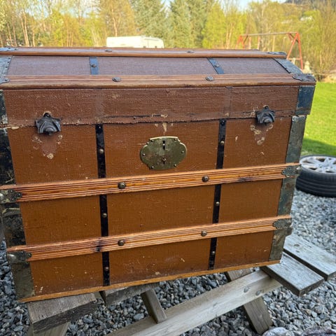Ukjent alder på denne kisten. Den har fine treskjæringer og god mulighet for oppbevaring. Må hentes