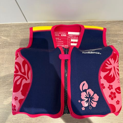 Vesten er laget for barn med vekt 19–30 kg, i henhold til merking på innsiden (EN13138-1:2021). Den har glidelås foran og justerbar stropp mellom beina for bedre passform og for å holde vesten på plass.