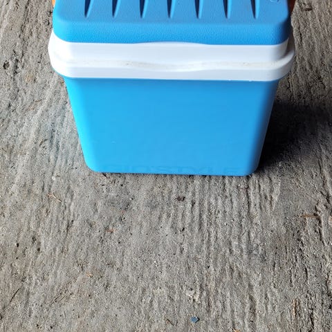 Kjøleboks i plast med grønn base, hvit innerside og gult lokk. Boksen har bærehåndtak på sidene for enkel transport. Egnet til oppbevaring og nedkjøling av mat og drikke på tur, strand, piknik eller lignende. Størrelse og volum er ikke oppgitt, men boksen har rektangulær form med avtagbart lokk.