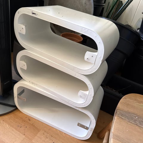Kan fint leve videre. Bitteliten skade på nederste hylleplate (se bilde). Jeg la ikke merke til den før jeg tok bilde av hylla.