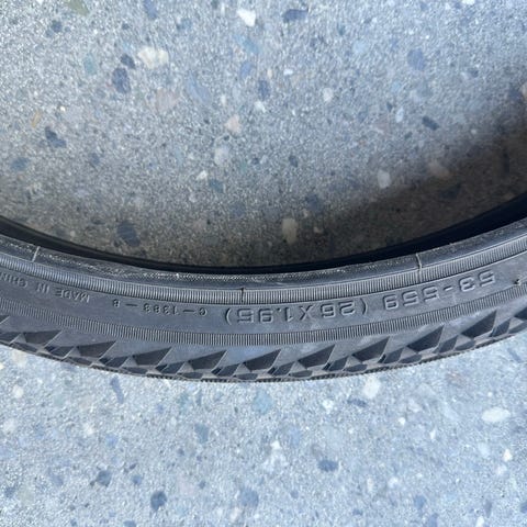 Selger to Schwalbe Super Moto sykkeldekk i størrelse 26x2.40 med klassisk hvit strek langs siden. Passer til bysykkel, el-sykkel eller tursykkel med 26” hjul.