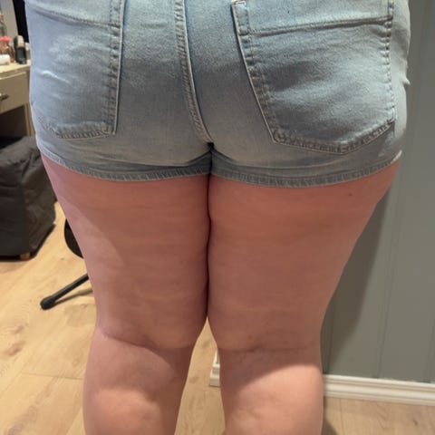 Envii denimshorts i størrelse M. Shortsene er i blå denim med beltehemper og lukkes med knapp og glidelås. Modellen kan både ha oppbrettede benkanter eller brettes ned for litt lengre benlengde. Modell: ENBILOBA SHORTS 7215