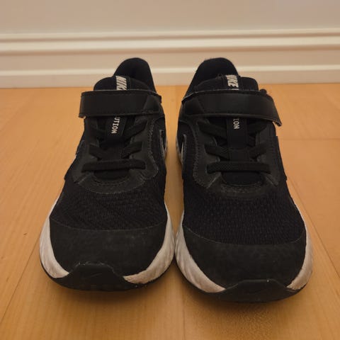 Nike joggesko for barn i størrelse 28,5. Skoene er unisex og kommer i svart. Skoene brukt av et barn i bare noen få måneder indors.