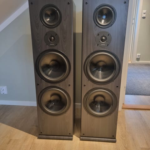 gulvstående høyttalere i trefinish. Membraner er ødelagt.