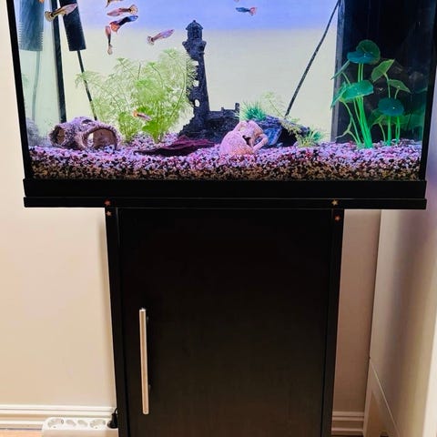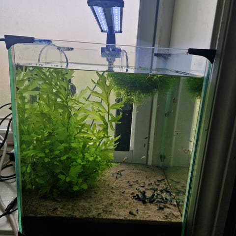 Jeg selger et 80 liters akvarium med over 200 reker og fisk. Rekene finnes i alt fra svart, grønt, gull og rødt og andre farger. Jeg vet ikke det nøyaktige antallet, men det er mange. Det finnes også et par L144. Dem pleier å legge egg.