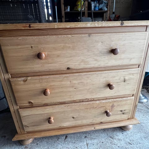 Solid furukommode. Med lås på hver skuff. Kommoden kan være fra tidlig 1900 tallet. Noen bruksmerker, men helt fin å se på.