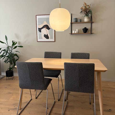 6 stk Skeidar Naxos spisestuestol i grått tekstil med polstret sete og rygg. Stolen har høy rygg med vertikale sømmer og slanke metallben i metallfinish. Egnet som spisestuestol rundt spisebord i stue eller kjøkken. Sittehøyde 47 cm.