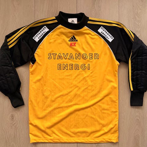 Fann ei urgammal fotballdrakt frå Brattvåg. Produsert av Adidas, sannsynlegvis frå 70- eller 80-talet basert på design og patina. Nummer 7 på ryggen. Størrelse medium.