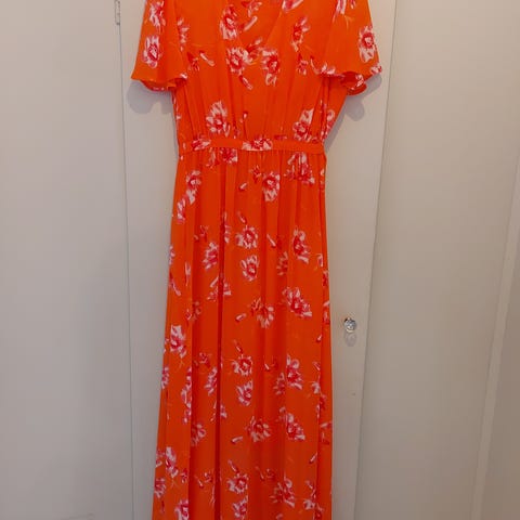 Jean Paul sommerkjole for dame i størrelse XL. Kjolen er rød med lyst blomstermønster og er laget i polyester. Den har v-utringning, korte vide ermer og markert liv med rynket skjørt. Stoffet er lett og egner seg godt til bruk på varme dager eller til hverdags og enkle anledninger. Lett og behagelig 🌸☺️ frakt kommer i tillegg:)