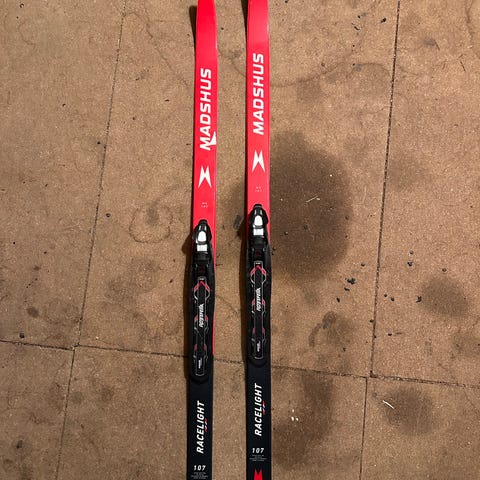 Madshus Racelight skin 107 langrennsski med integrerte feller og Rottefella-bindinger.