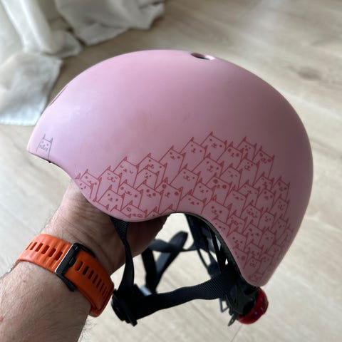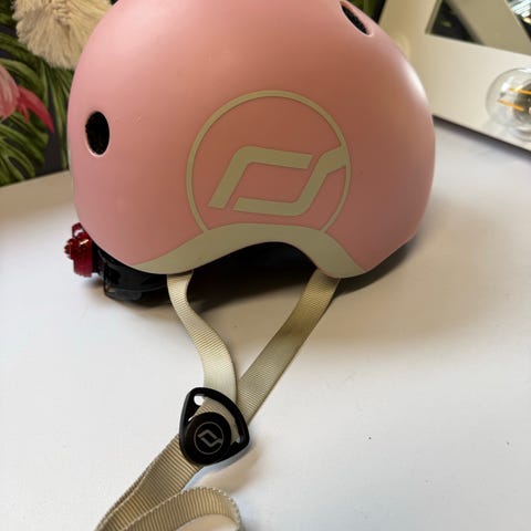 Scoot and Ride hjelm i rosa farge. Hjelmen har flere ventilasjonshull, justerbar innvendig stramming og svarte justerbare stropper med spenne under haken. Egner seg til bruk ved sparkesykkel, sykkel eller annen lignende aktivitet der hodebeskyttelse er nødvendig.