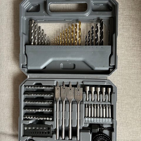 Borsett i plastkoffert med et stort utvalg bor og bits. Inneholder blant annet spiralbor i ulike størrelser, flatbor, hullsager og diverse bits og tilbehør. Leveres i solid koffert med formstøpt innredning som holder delene på plass under transport og oppbevaring. Egnet for ulike typer bore- og skrujobber i hjem og verksted, avhengig av hvilke maskiner og materialer settes brukes til.Første mann til mølla…