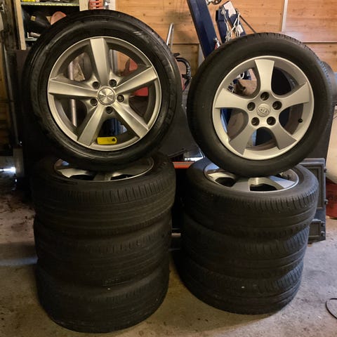 Komplette hjul selges rimelig da den ene felgen bærer preg av kantkjøring. Felgene er av typen Brock B32, 8,5x19". Dekkene er av typen Michelin Primacy 4. Hjulene har stått på en Polestar 2.