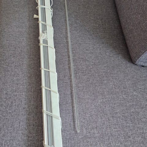 Den er helt ubrukt, kun kappet for å passe et smalere vindu. Medfølgende skruer og feste, samt bruksanvisning.
