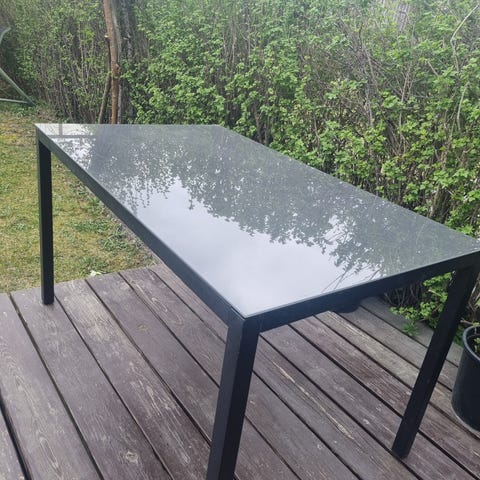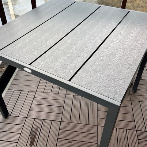 Hagebord i kunstrotting med kvadratisk bordplate. Farge i grå nyanser. Bordet er egnet til utebruk på terrasse, balkong eller i hage. Mål på bordplaten er omtrent 80 x 80 cm.
