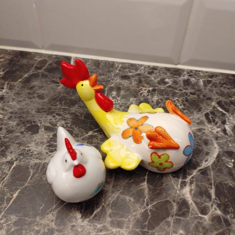 Påske salt- og pepperbøsser i keramikk. Sett med to bøsser formet som høner, i hvit keramikk med røde kammer og nebb samt flerfargede prikker i grønt og oransje. På undersiden er det åpning for påfylling av salt og pepper. Produktet er merket med informasjon om at det ikke tåler oppvaskmaskin og kan krakelere ved feil behandling. Egnet som funksjonell borddekorasjon til påske og andre anledninger.