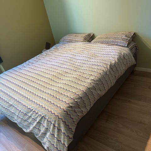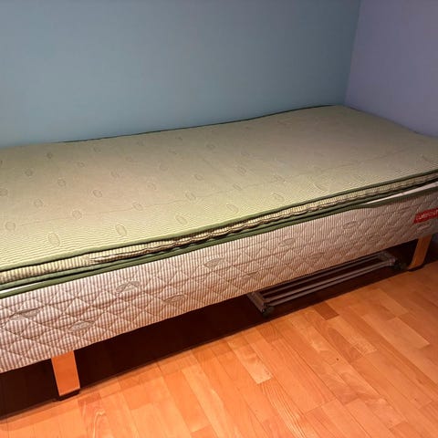 Usikker på merke. Denne sengen er veldig behagelig med en tynn overmadrass og en tykk undermadrass. Den er godt brukt og overmadrassen har en del bruksmerker men den er bare og bytte ut hvis man vil. Sengen må hentes.