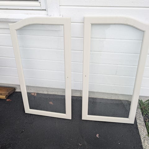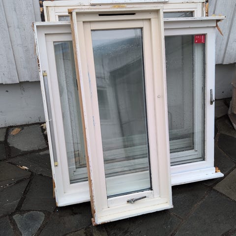 3 hjemmelaget vinduer i hvitmalt treverk. Enkeltglass. Kan brukes f.eks til drivhus. 103x118cm komplettmål per vindu.