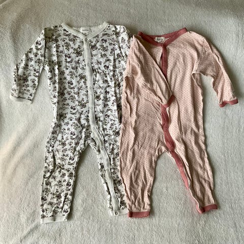 Reflex og Name it ulldress for jente i størrelse 74 i rosa ull. Heldressene har lange ermer og ben, og lukkes med knapper eller glidelås foran. En av dressene er ensfarget rosa med blondekant, hvor det er merke på den ene foten, men ikke hull igjenom, den andre er rosa med blomstermønster.