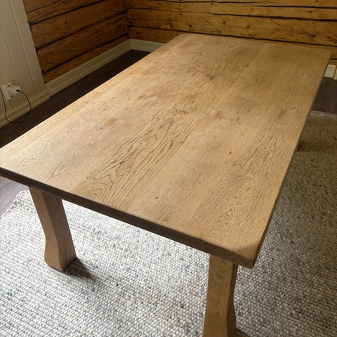 Swedese spisebord i heltre med rektangulær bordplate og utskårne bordben. Bordet har lys trefinish og klassisk, robust utførelse. Designet av Alfred Homann. Egnet som spisebord eller arbeidsbord i stue, kjøkken eller hytte. Bordet står på to kraftige endestykker med gjennomgående fotplate for stabilitet. Overflaten har synlig trestruktur som gir et naturlig uttrykk.