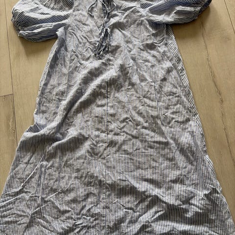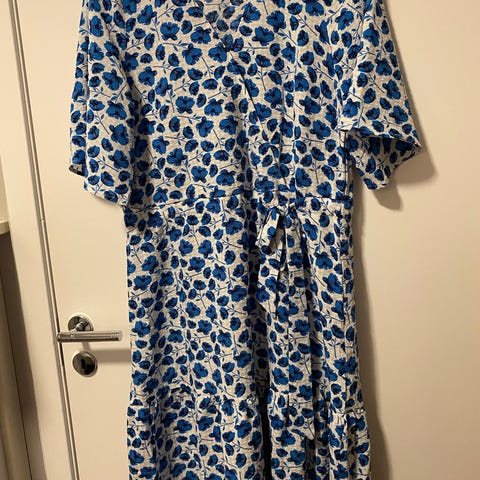 Modellen har korte ermer, V-hals og avtagbart knytebelte i livet. Lengden går omtrent til under kneet, avhengig av høyde.