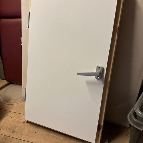 Døren har slett overflate og er hengslet på siden. Målene er 109 x 209 cm