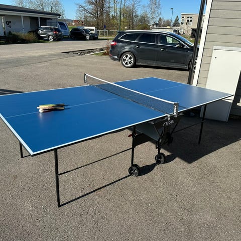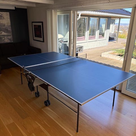 Bordtennisbord i standard størrelse med blå spilleflate og hvite linjer. Bordet står på sammenleggbart stativ med hjul for enklere flytting og lagring. Nett følger med, og bordet egner seg til innendørs bruk i for eksempel kjeller, garasje eller fellesrom. Passer til bordtennis med vanlige racketer og baller.