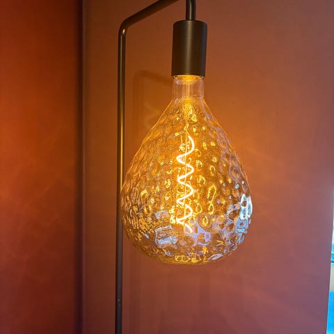 This is a floor lamp made of metal and is very sturdy. It is 179cm in height and has a circular base that is 28cm in diameter. The shade is made of glass and is 36cm in diameter. Everything is in good working order.