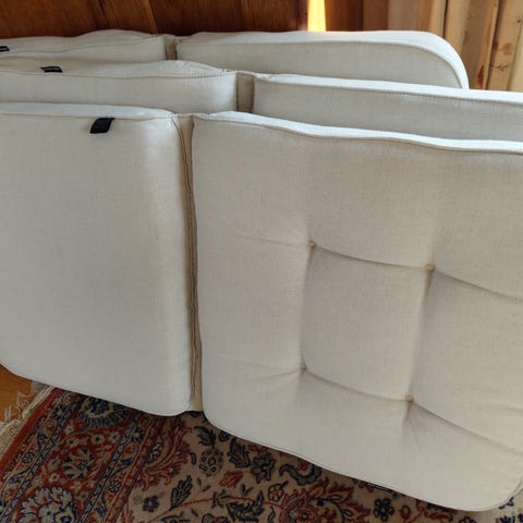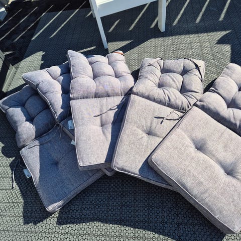 4 stk beige stolputer til høy rygg , str 70 cm ( rygg) x 45 cm sitte bredde. 2 stk blå stolputer, samme str. Beige pr stk kr 300,-. Blå pr stk 200,-