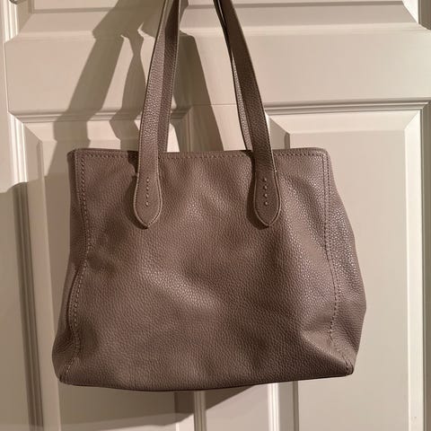 Christian Laurier skinnveske for dame i taupe-farge med gullfarfer hardware. Vesken er laget av preget lær og har doble hanker samt skulderrem. Den har glidelåslomme på utsiden og hovedrom med glidelåslukking. Avskiller med glidelåslomme inni hovedrommet. Passer til hverdagsbruk og til å bære med nødvendigheter.