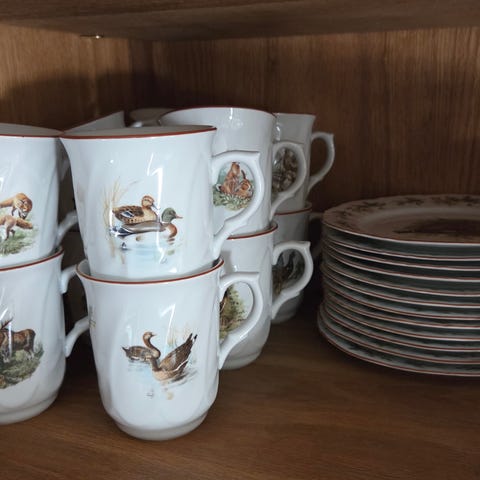 Firkløveren karaffel og seks glass. Glassene er i ulike farger, ulik fargemetning og vekt. Har dekor med mønster og gullfarget kant. Karaffelen er gjennomsiktig med tilsvarende dekor og propp i glass.
