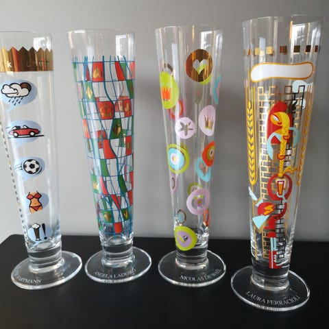 Ritzenhoff ølglass og shotteglass med ulike motiver. Settet består av 4, evnt 6, høye og lave glass i klart glass med trykte dekorative figurer og mønstre i ulike farger. Glassene har fot og er egnet til servering av for eksempel øl, brus eller andre kalde drikker.