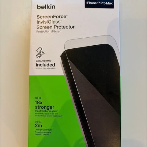 Belkin ScreenForce TemperedCurve skjermbeskytter til iPhone 8, 7, 6s og 6. Skjermbeskytteren er laget av herdet glass med buet kant for å dekke mest mulig av skjermen. Den er designet for å være kompatibel med de fleste deksler og har overflate som motvirker fingeravtrykk. I pakken følger det med monteringsramme og veiledning for enkel og presis montering på telefonens skjerm.