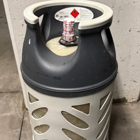 AGA nykjøpt propanflaske med 10 kg gass i lett komposittmateriale. Forseglingen er fortsatt intakt. Flasken har ventil på toppen og bærehåndtak integrert i flaskekroppen. Egnet til bruk med propanbasert utstyr som grill, kokeapparat eller varmeovn som er tilpasset denne typen flaske og ventiltilkobling.
