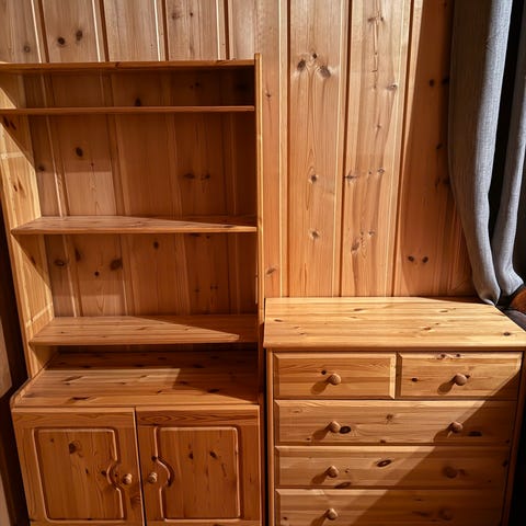 Hylle med skap i treverk selges