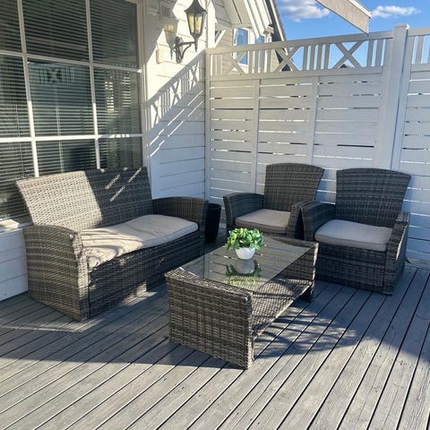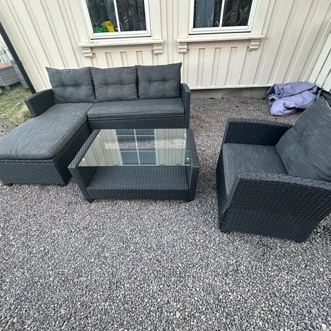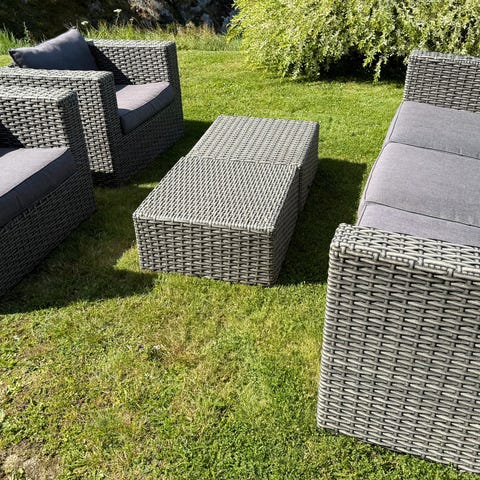 Møblementet er i pent tilstand uten skade , både sitte og rygge puter medfølge og der er også i fint tilstand uten flekker eller solblekket .