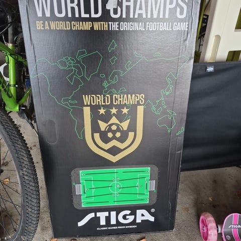 Stiga Bordfotballspill med skyvespillere. Spillet består av en fotballbane på plate med markerte banestreker og mål i hver ende. Spillerne er festet på stenger som skyves langs banen for å styre bevegelsene. Egnet som bordspill for barn og voksne, og kan brukes innendørs på bord eller gulv. Ingen spesifikke merke- eller materialopplysninger er tilgjengelige.
