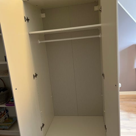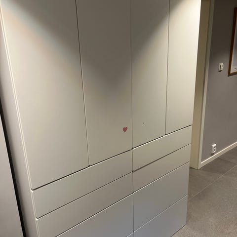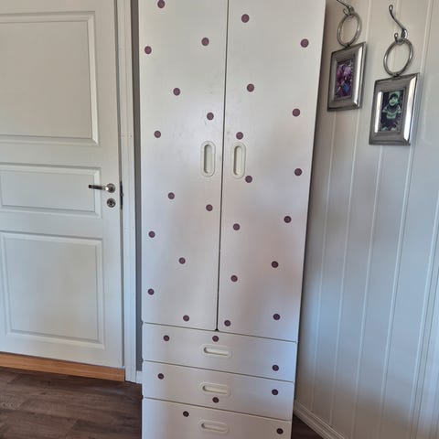 IKEA garderobeskap i hvit utførelse. Skapet har to dører med enkle håndtak. Egnet til oppbevaring av klær eller leker på barnerom eller soverom. Nøytral farge som passer inn i de fleste rom og innredningsstiler.