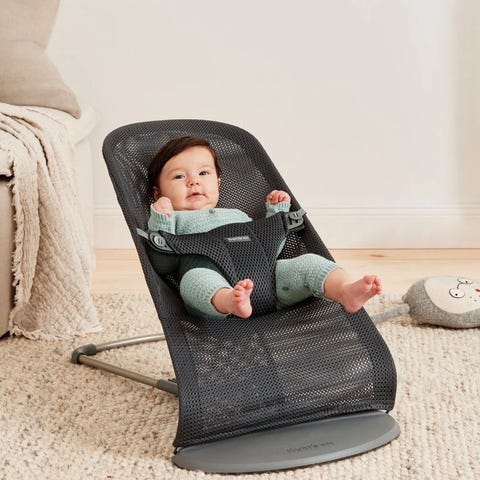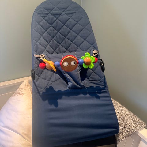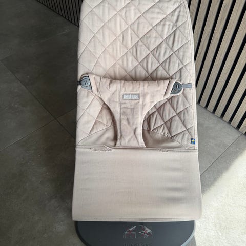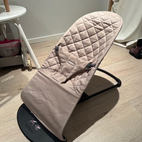 Babybjörn vippestol i rosa farge. Stolen har polstret, vattert trekk med rutemønster og integrert sele foran. Stabil metallramme med justerbar posisjon for barnet. Egnet som sitte- og hvileplass for små barn. Trekket kan tas av for rengjøring. Stroppene nederst for å feste trekket fast har ryket, men har ingenting å si for bruken. Selges fordi barnet har vokst ut av den.