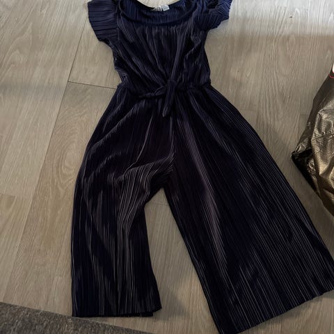 Cubus jumpsuit for jente i størrelse 146. Jumpsuiten er svart og laget i polyester. Plagget har plisserte ben og overdel, med volangdetaljer over skuldre og ermer. Den har glitrende effekt i stoffet og åpning bak i nakken. Egnet som penplagg til ulike anledninger for barn i aktuell størrelse.